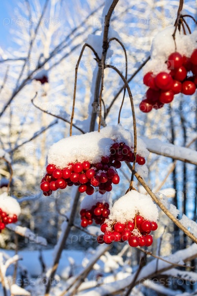 Заснеженные красные плоды калины крупным планом