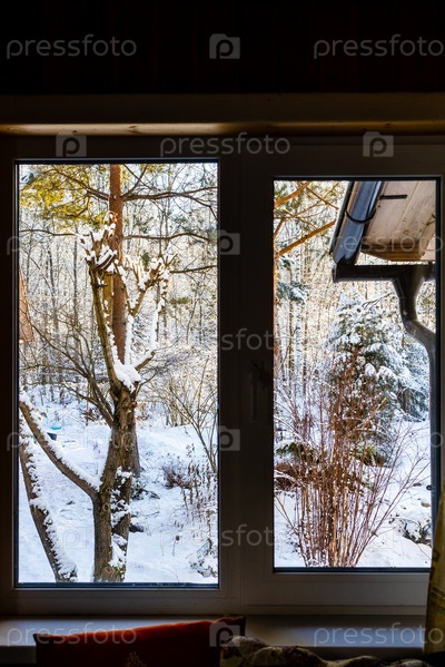 Вид из окна деревенского дома на заснеженный двор