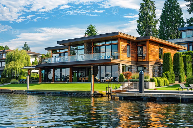Элегантный современный дом на берегу озера с большими стеклянными стенами и пирсом