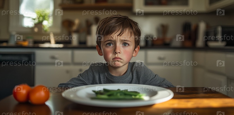 Ребенок не хочет есть овощи на деревянном столе в уютной кухне