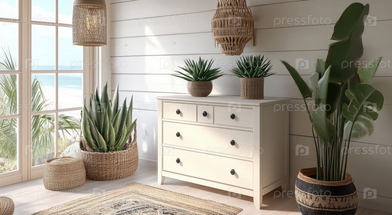 Эта уютная гостиная демонстрирует стильную богемную эстетику с обилием зелени и естественным освещением, создавая спокойную и уютную атмосферу, идеально подходящую для отдыха