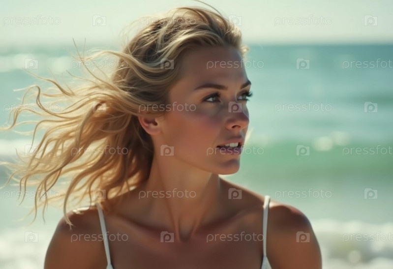 Блондинка стоит на берегу океана или моря, наслаждаясь солнцем и серфингом, одета в стильный купальник, подчеркивая расслабленную пляжную атмосферу. Красивое молодое лицо. Реклама для одежды или пляжного путешествия. AI