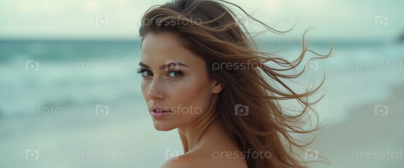 Брюнетка в купальнике оглядывается назад, стоя у береговой линии. Нежные морские волны пляшут у ее ног под ясно голубым небом. Длинные волосы, красивое молодое лицо. Реклама путешествий и одежды. AI