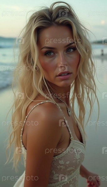 Блондинка стоит на берегу океана или моря, наслаждаясь солнцем и серфингом, одета в стильный купальник, подчеркивая расслабленную пляжную атмосферу. Красивое молодое лицо. Реклама для одежды или пляжного путешествия. AI
