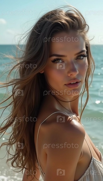 Брюнетка в купальнике оглядывается назад, стоя у береговой линии. Нежные морские волны пляшут у ее ног под ясно голубым небом. Длинные волосы, красивое молодое лицо. Реклама путешествий и одежды. AI