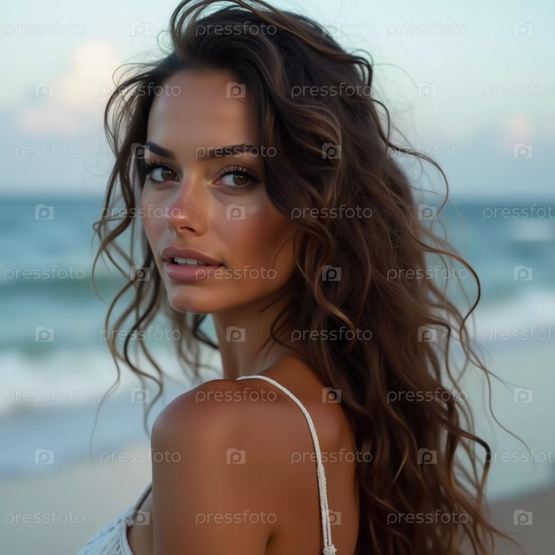 Брюнетка в купальнике оглядывается назад, стоя у береговой линии. Нежные морские волны пляшут у ее ног под ясно голубым небом. Длинные волосы, красивое молодое лицо. Реклама путешествий и одежды. AI