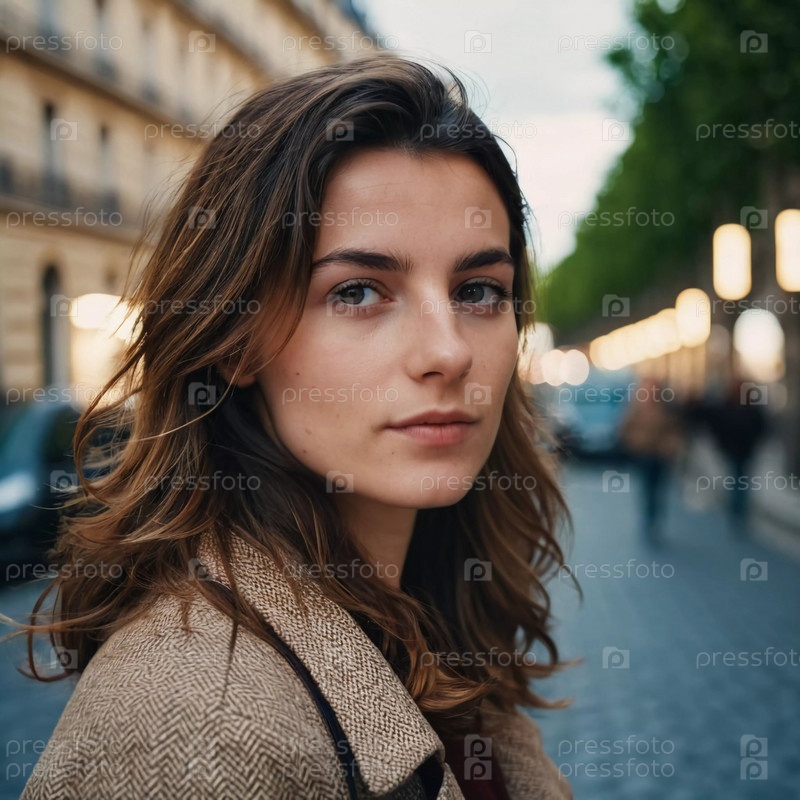 Молодая брюнетка 25 лет уверенно стоит на парижской улице в сумерках, мягкие городские огни освещают ее нежные черты, отражая спокойствие и городское очарование. Генеративный ИИ