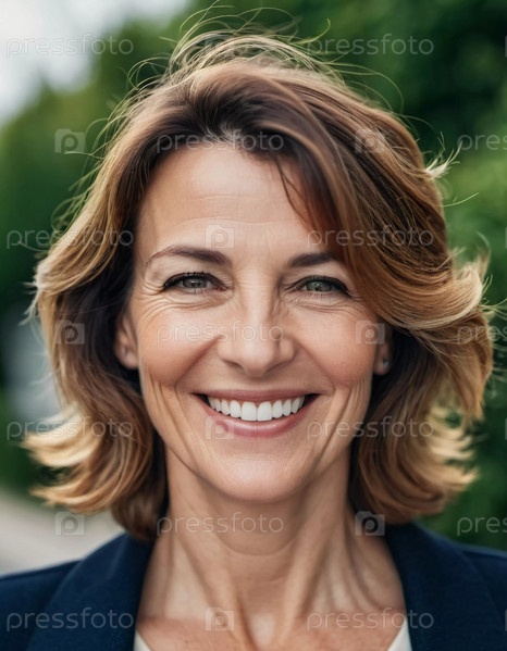 Веселая женщина 50 лет стоит на причудливой французской улице, ее улыбка яркая на фоне теплого солнечного дня. Пейзаж воплощает безмятежную и радостную атмосферу. Генеративный ИИ