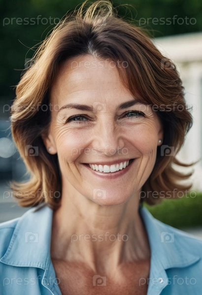 Веселая женщина 50 лет стоит на причудливой французской улице, ее улыбка яркая на фоне теплого солнечного дня. Пейзаж воплощает безмятежную и радостную атмосферу. Генеративный ИИ