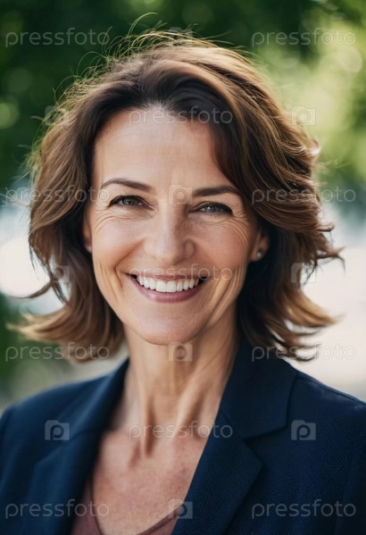 Веселая женщина 50 лет стоит на причудливой французской улице, ее улыбка яркая на фоне теплого солнечного дня. Пейзаж воплощает безмятежную и радостную атмосферу. Генеративный ИИ