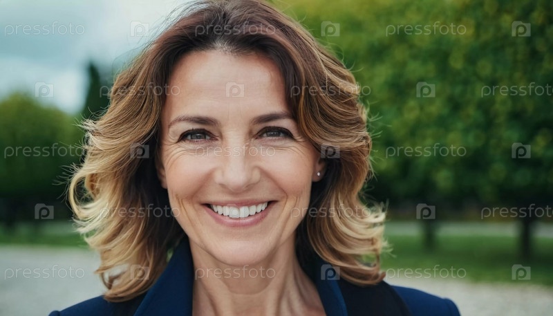 Веселая женщина 50 лет стоит на причудливой французской улице, ее улыбка яркая на фоне теплого солнечного дня. Пейзаж воплощает безмятежную и радостную атмосферу. Генеративный ИИ
