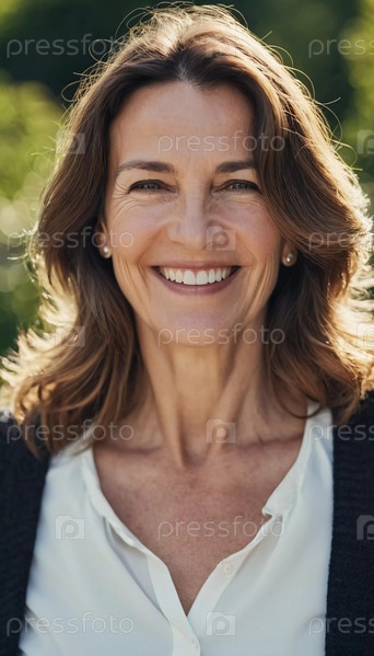 Веселая женщина 50 лет стоит на причудливой французской улице, ее улыбка яркая на фоне теплого солнечного дня. Пейзаж воплощает безмятежную и радостную атмосферу. Генеративный ИИ