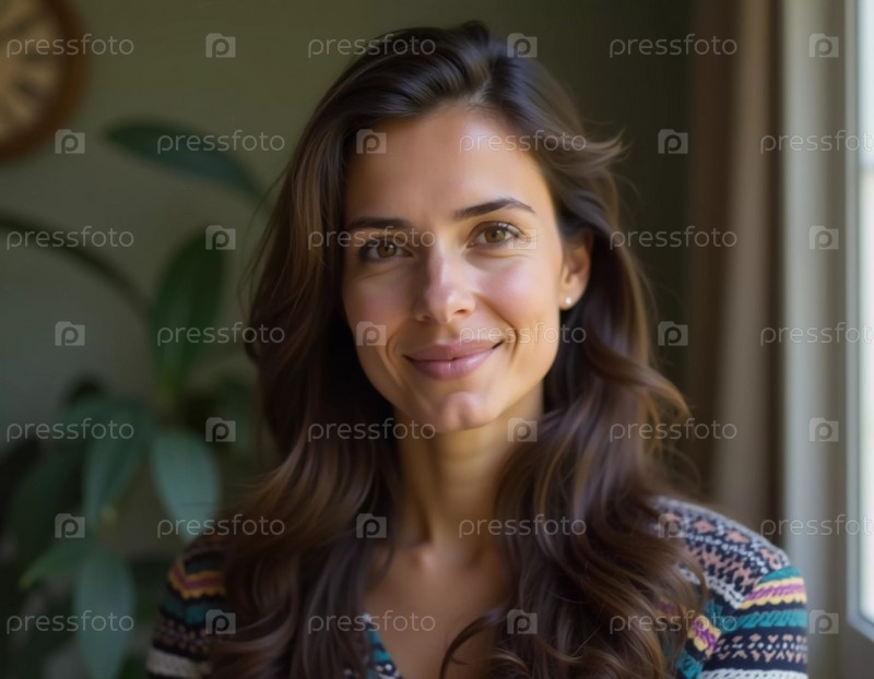 Женщина с длинными темными волосами тепло улыбается, стоя в помещении, освещенном естественным светом. На заднем плане видны зеленые растения, создающие спокойную атмосферу. Генеративный ИИ