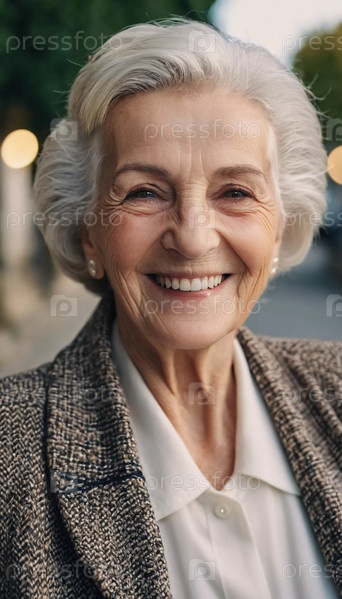 Утонченная улыбающаяся пожилая француженка на открытом воздухе. манера поведения раскрывает жизненный опыт и размышления, воплощая изящество и мудрость. ухоженная женщина 70 лет с седыми волосами