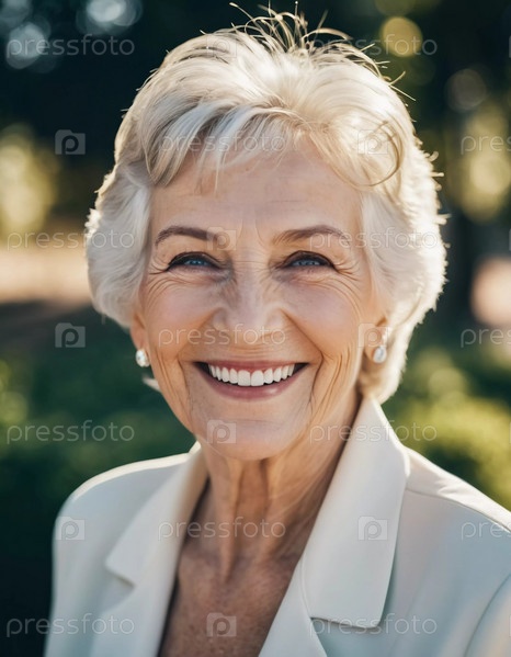 Утонченная улыбающаяся пожилая француженка на открытом воздухе. манера поведения раскрывает жизненный опыт и размышления, воплощая изящество и мудрость. ухоженная женщина 70 лет с седыми волосами