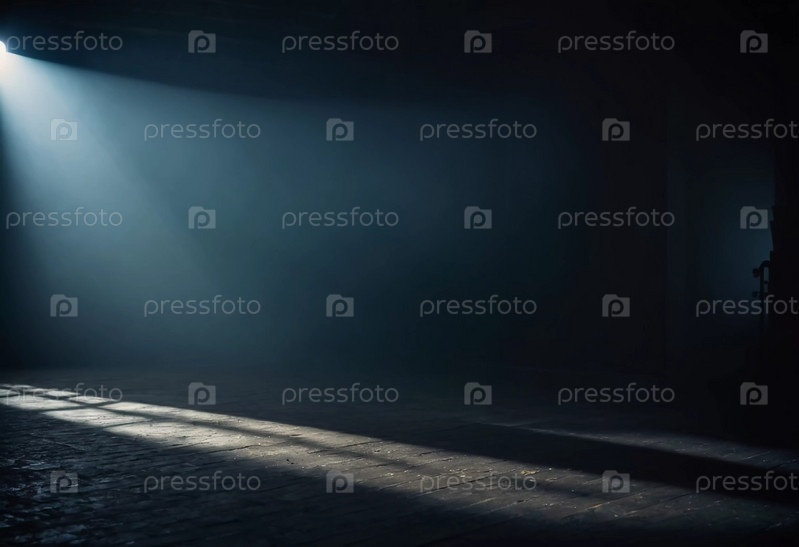 Впереди тянется темный коридор, освещенный слабым верхним светом, который создает зловещие тени на деревянном полу, создавая леденящую атмосферу. Генеративный ИИ