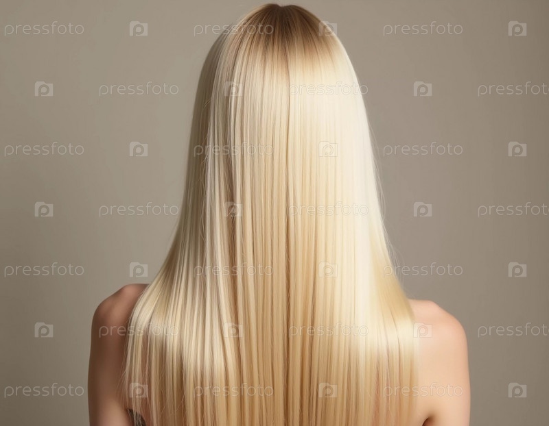 Гладкие, прямые светлые волосы элегантно протекают по спине, подчеркивая их здоровый блеск и равномерный цвет, освещенные мягким освещением, создавая эффектный вид