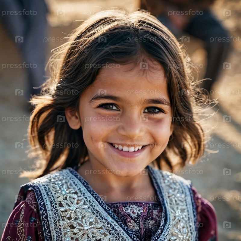 Милая девочка 5 лет из Афганистана в национальной одежде улыбается, демонстрируя свой традиционный наряд, ее выразительные глаза отражают ее окружение и культуру. Генеративный ИИ