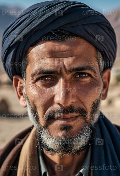Афганский мужчина средних лет (45 лет) уверенно стоит в сельской местности, демонстрируя свою традиционную одежду и задумчивый взгляд на фоне безмятежного пейзажа своей деревни. Генеративный ИИ