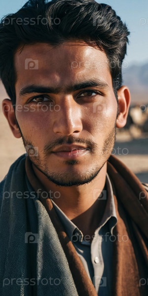 Молодой человек 25 лет из Афганистана, одетый в традиционную одежду, гордо позирует в своей деревне на фоне гор, демонстрируя свое культурное наследие. Генеративный ИИ