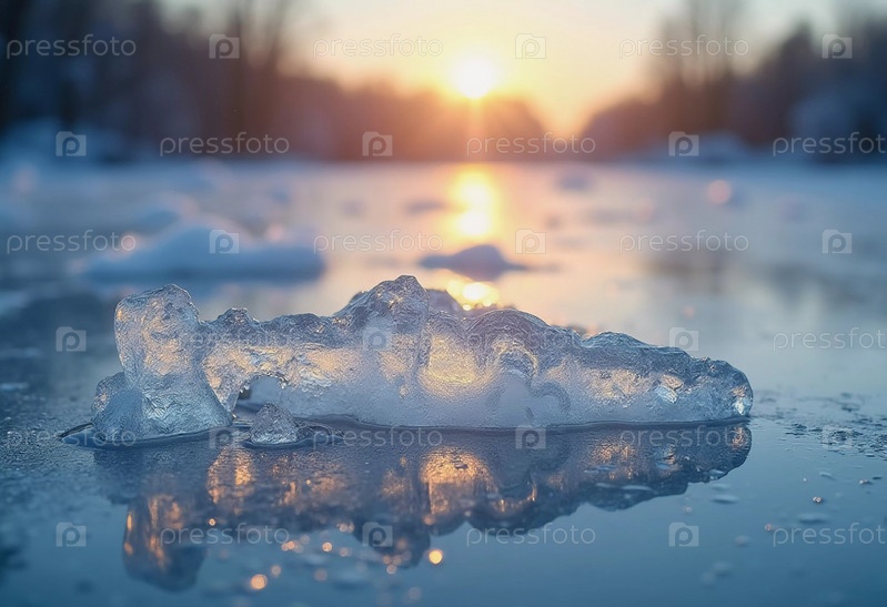 Солнечный свет пробивается сквозь деревья на рассвете, отражаясь от спокойной реки, усеянной тающим льдом. Сосульки висят рядом, создавая мирную и теплую весеннюю атмосферу. Генеративный ИИ