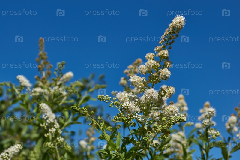 Большой план цветущего соцветия спиреи иволистой на фоне зеленого листа