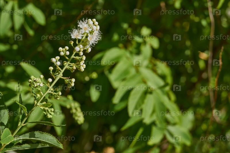 Большой план цветущего соцветия спиреи иволистой на фоне зеленого листа