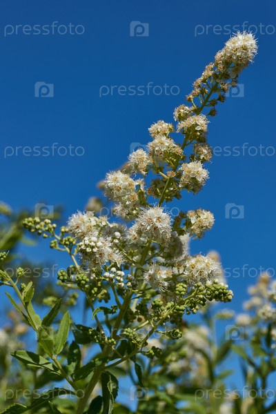 Большой план цветущего соцветия спиреи иволистой на фоне зеленого листа