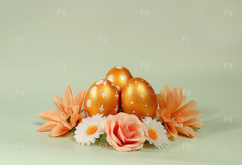 Абстрактная пасхальная композиция с расписными золотыми яйцами и весенними цветами. Шаблон праздничного дизайна и баннер для экрана, минимальная пасхальная концепция, выборочный фокус