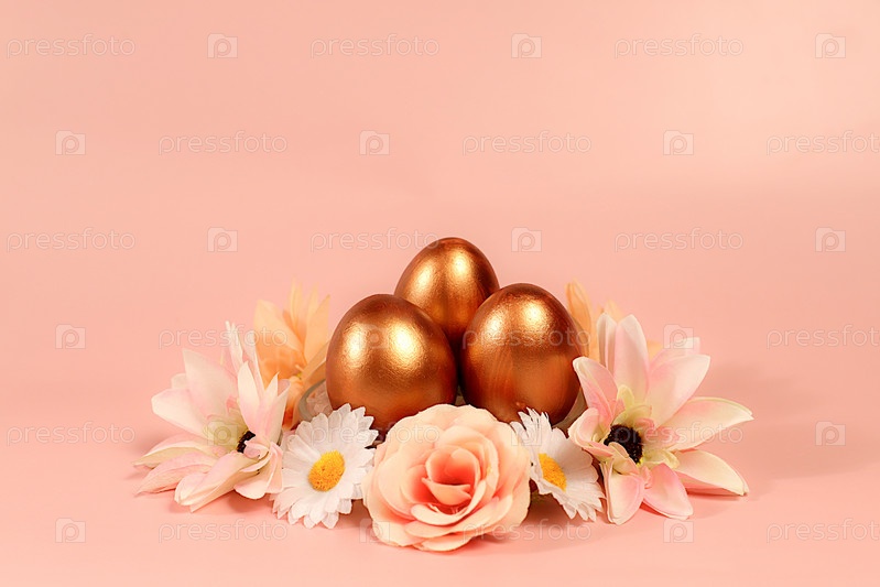 Абстрактная пасхальная композиция с расписными золотыми яйцами и весенними цветами. Шаблон праздничного дизайна и баннер для экрана, минимальная пасхальная концепция, выборочный фокус