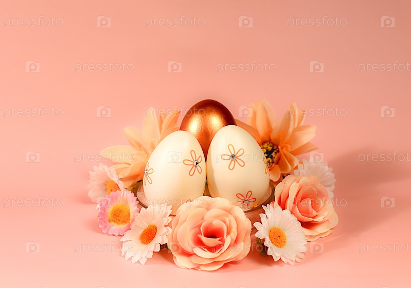 Абстрактная пасхальная композиция с крашеными яйцами и весенними цветами. Праздничный шаблон для дизайна и баннер для экрана, минимальная пасхальная концепция, селективный фокус