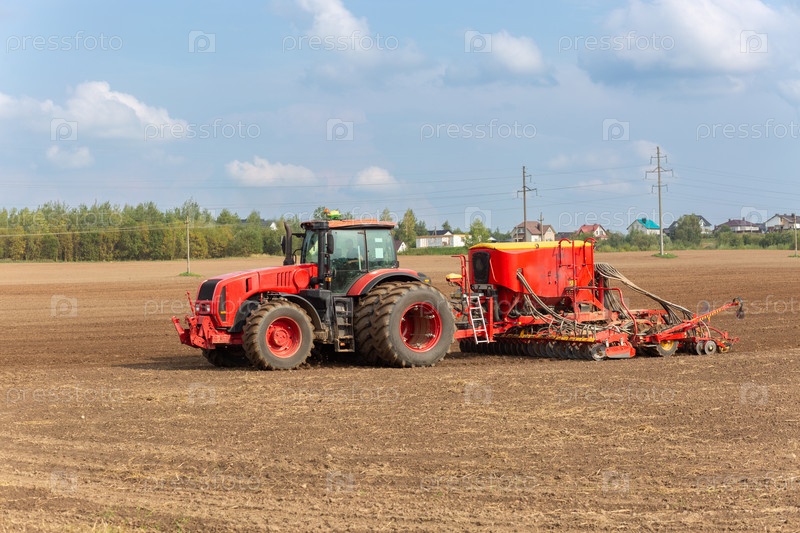 Трактор с пневматической сеялкой сеет семена, одновременно внося удобрения в почву. Фермер засевает свои загоны весной с помощью пневматической сеялки позади красного трактора
