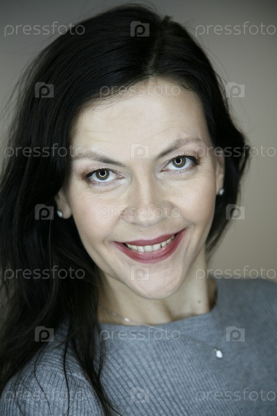 Портрет улыбающейся жизнерадостной счастливой брюнетки средних лет 51 год с вечерним макияжем и естественной укладкой волос