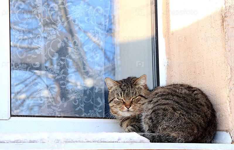 Серый пушистый полосатый кот дремлет на заснеженном окне под лучами зимнего солнца. Сибирские кошки не боятся холода и суровых зимних морозов, они спят на улице в снегу. Избирательный фокус