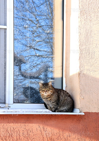 Серый пушистый полосатый кот дремлет на заснеженном окне под лучами зимнего солнца. Сибирским котам, которые не боятся холода, не страшны суровые зимние морозы. Избирательный фокус