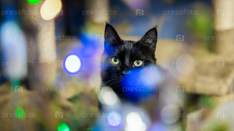 Черный кот с удивлением смотрит на рождественскую елку с праздничными огнями