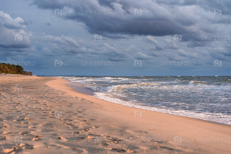 Песчаный осенний пляж, волны на море и облака на заднем плане