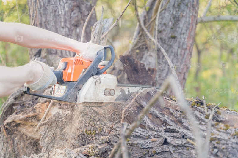 Фермер пилит дерево бензопилой, выборочная фокусировка, фокус на переднем плане, размытый фон