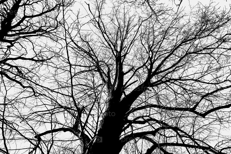 Черный силуэт ветвей большого дерева на белом фоне