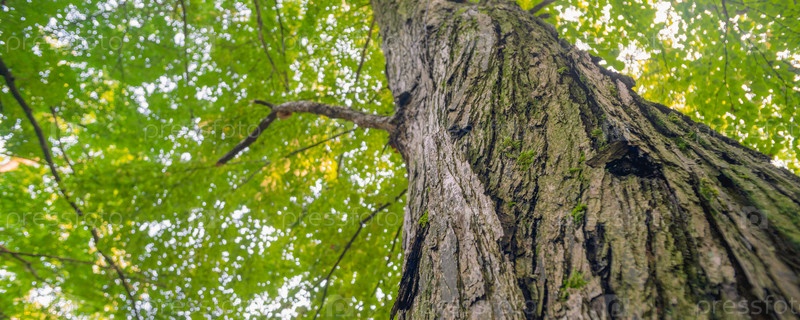 Большие деревья в лесу с пышной зеленой листвой, вид снизу
