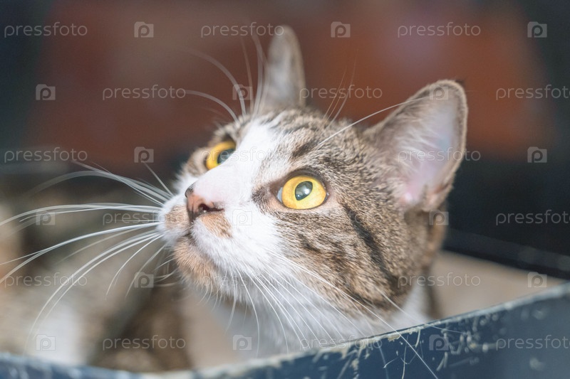 Молодая кошка чувствует себя комфортно в своей любимой коробке