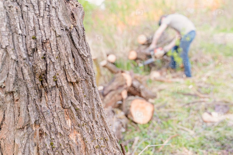 Фермер пилит дерево бензопилой, выборочная фокусировка, фокус на переднем плане, размытый фон