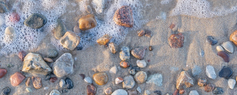 Морская пена на мокрой гальке на пляже в солнечный день, крупный план