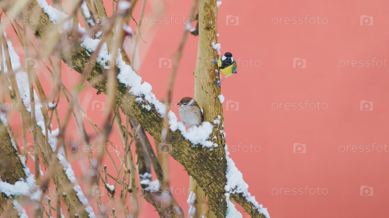 Птицы сидят на ветвях замерзшего дерева холодным зимним днем