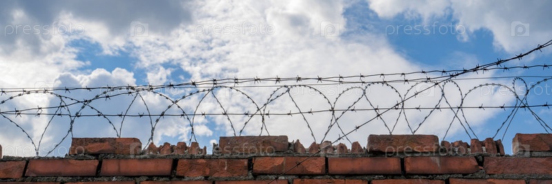 Кирпичная стена с колючей проволокой, на фоне голубого неба