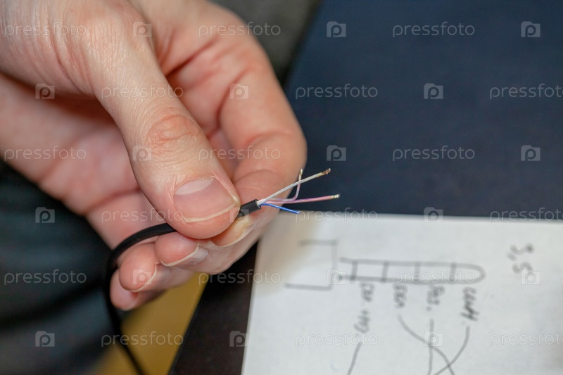 Электрик ремонтирует электрический компонент, на столе с устройством и инструментами, крупный план, размытый фон