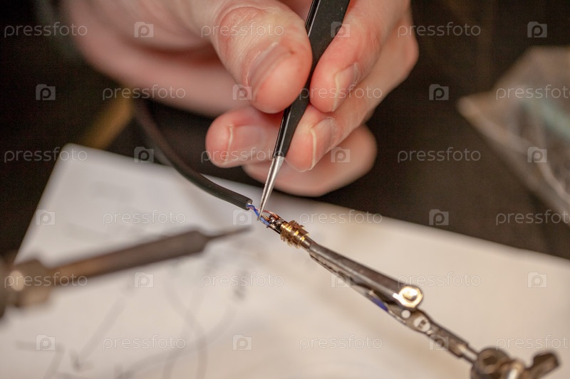 Электрик ремонтирует электрический компонент, на столе с устройством и инструментами, крупный план, размытый фон