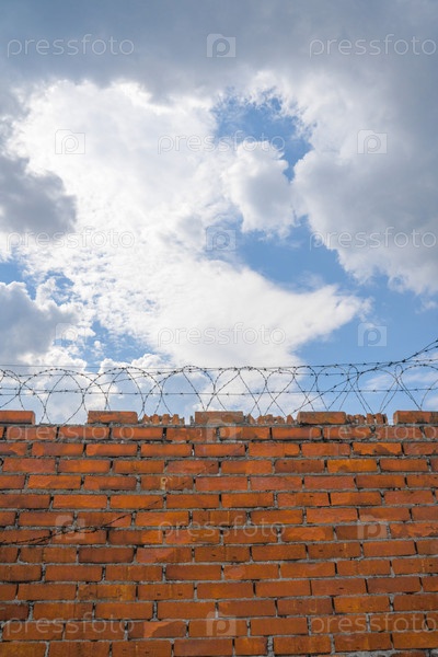 Кирпичная стена с колючей проволокой, на фоне голубого неба