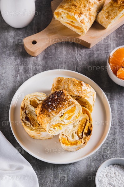 Вкусный рулет с творогом и мандарином на тарелке на столе вертикальный вид