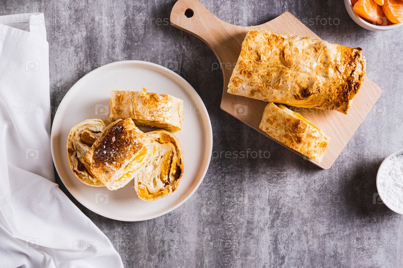 Сладкий рулет из творога с мандарином, завернутый в лаваш на тарелке на столешнице